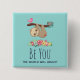 A button with an amusing saying: Be You the world will adjust. Designed with an illustration of a cute brown sloth hanging upside down. This funny little guy is holding onto a branch which has a little pink bird on one side of the branch and a doodle-style rose bouquet on the other side. Below them is an arrangement of colourful hand-drawn flowers. This adorable sloth also has pink rosy cheeks and 3 cute little hearts on his butt.