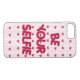inspirational quote "be your selfie" on pastel pink with red hearts background