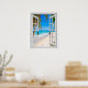 Ocean view fake window. Beach and palm trees scene, for a windowless office wall. Fun, realistic optical illusion scenic poster for an office or study wall.
