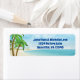 This address label features a tropical beach with palm trees. The water is a beautiful blue and there are clouds scattered in the sky. -