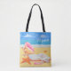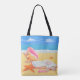 Stay in a beachy state of mind all the time with this personalized tote bag, featuring a conch, starfish and a good book. Personalize with any name. Great as a beach bag.