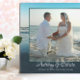 Standing photo frame plaque that is made to last. Blue ocean water and sky make up the background to frame a large photo of a couple on their wedding day. Names are added beneath the picture in elegant, swirling script. Another line of printed text can hold the date and location of the ceremony.