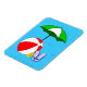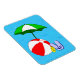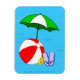 Fun beach or swimming pool themed art of a red beach ball, green sun umbrella, vacation sandals and suntan oil on a wavy blue background.