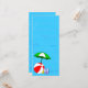 Fun beach or swimming pool themed art of a red beach ball, green sun umbrella, vacation sandals and suntan oil on a watery blue background with curly waves.