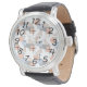 This men's watch has a Bauhaus design of repeating rectangles, squares, diamonds, and triangles in beach colours of tan, grey, blue, and orange.
