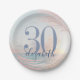 Beach Themed Birthday Beach Party Paper Plates Personalized with Any Age and Name or Custom Text with pastel rose gold, pink, teal, blue, and peach faded beach photo background and modern minimal pink palm leaf border with a bold age and name in navy blue. Edit the age to work for any little girly, teen, or adult woman's tropical beach birthday party.