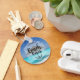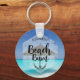 A personalized keychain with a tropical image of a turquoise sea with a white sandy beach and a single thatched beach umbrella. Typography says Beach Bum.