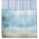 Tropical cloth shower curtain done in graphics of a lovely sandy beach scene complete with palm trees and blue water. A blue, green and white striped valance, across the top, gives the impression of a tent style cabana.