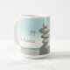 Start your morning with this 15 ounce coffee mug featuring a beach landscape with cairn stones in the foreground with the customizable words, "Joy, Peace, Mindfulness and serenity.