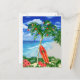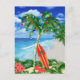 Happy Holidays from the warm sandy beaches of your favourite tropical island beach. Palm tree decorated with Christmas ornaments and lights, with a retro surfboard leaning against the Christmas tree.