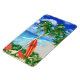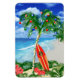 Happy Holidays from the warm sandy beaches of your favourite tropical island beach. Palm tree decorated with Christmas ornaments and lights, with a retro surfboard leaning against the Christmas tree.