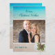 Beach Christmas photo card with custom greeting and signature on front of flat cards. Add a horizontal (landscape) photo of family, couple, or single person over a seacoast background image with tropical blue water and beach sand. Starfish, holly and sand dollar image decorates the lower corner to enhance the tropical theme.