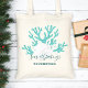 Personalize this beach Christmas tote bag with aqua blue glitter coral, white sand dollar and starfish, and the holiday message “Seas & Greetings”.