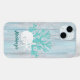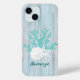 Personalize this coastal beach driftwood phone case, with a white sand dollar and 2 starfish and aqua glitter coral branch, for yourself or a gift.