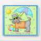 “I’m ready to Play” - aren’t you. This dog’s ready for fun time at the beach with a beach ball and umbrella. With the cool sunglasses, fuchsia and turquoise flip flops, orange beach tee shirt and a purple beach hat, he’s ready to go, dressed in style. The background is green with purple stars and a blue border. The sun is out and shinning for a perfect day and he’s ready for you to toss the ball.