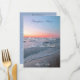The Beach View wedding collection features a beautiful calm and romantic beach view scene. The front of the design features a beach view photo of calm and romantic waves gently rolling onto the sand and grass of the shore line at sunrise. The beautiful glow of the sunrise has cast an array of colours in the horizon and reflecting off the ocean waves. As you stare into the rolling waves you can almost feel the ocean breeze and taste the salt in the air. The photo was taken at sunrise on Hilton Head Island, South Carolina. The backside of the invite is originally designed in a calming blue shade, but can be changed to any colour by using the "customize it" feature. Use the custom wording template to personalize your wedding reception menu with your own wording. This design is wonderful addition to any outdoor or beach themed wedding.