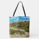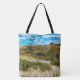 The original artwork by ZoeSPEAK on this large Tote Bag is a view of beach greens, sea oats and all the other beautiful plants which grow in the sand and help to strengthen our coastlines. The blue sky is filled with puffy white clouds, and in the distance, people can be seen at the water’s edge.