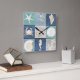 Vintage beach and sea themed images rendered in white and cream beige are arranged on an old wooden board background with squares tinted aqua, a deep and light blue, and soft white. Images pictured are a starfish, crab, sea shells, sand dollar, anchor, sea horse and two soaring sea gulls along with the words "the Beach is my happy place". Matching items and other beach and sea themed designs are available in my Zazzle store.