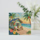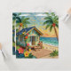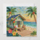 A pretty impasto beach themed blank card with a cute beach house, palm trees and tropical flowers.