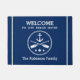 Welcome to Our Beach House personalized with your custom family name entryway doormat. Featuring a custom designed nautical boat anchor with crossed oars and rope boarders on beautiful navy blue. Easily change the background colour to match your current decor. Makes a great gift.