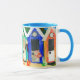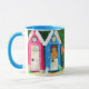 A good quality white 'ringer' mug with a blue rim and handle. The 'beach huts' design is made from a handpainted paper collage and is dishwasher and microwave safe. See other matching products, gifts and greeting cards.
