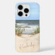 Tropical beach themed phone case with a photo of the seashore with sand dunes and sea grasses, with waves in the background and customizable name or text of your choice.