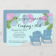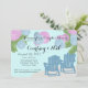 Pink and blue paper lanterns over adirondack chairs, beach theme couple's shower invitation.