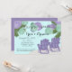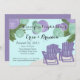 Purple and green paper lanterns over adirondack chairs, beach theme couple's shower invitation.