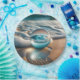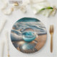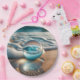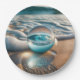 A glass sphere on the sandy shore reflects and refracts ocean waves within it, while the gentle foam of the sea surrounds it