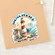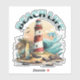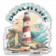 Beachy stickers. Illustration of a beachy scene with lighthouse, surfboards, palm trees and dolphin.