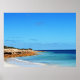 Pictured is aqua blue sea water with gentle waves lapping the sand, craggy rocks kissing the edge and a blue glorious sky