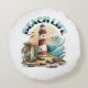 Beach themed throw pillow. Illustration of a beachy scene with lighthouse, surfboards, palm trees and dolphin.