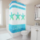 “Beach life”. Whenever you shower with this seaside shower curtain, you can be rest assured the summer seashore fun will continue. Three graphic, turquoise blue green ombre vintage starfish overlay a white background with sandy textured turquoise blue stripes. Great for the family beach house, your nautical lifestyle, or just to bring a bit of the beach into your home all year round!