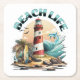 Beach House Décor. Illustration of a beachy scene with lighthouse, surfboards, palm trees and dolphin.