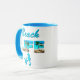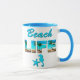 Coffee mug with the caption "Beach Life" embellished with an image of a sandy beach and palm trees, and a seahorse and starfish