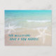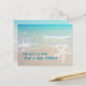 New address postcard announcement with beach theme. Sea and sand and starfish design with two text templates. Tropical blue ocean water is the background for your text. On the front, “We / I have a new address” or “We / I have moved”. Include names and address of new residence on the back. Transparent white sea stars decorate both sides.