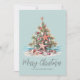 Celebrate the holidays with a bit of surf and sand with this shell and starfish Christmas Tree holiday card. Wish your loved ones a happy holiday season in beachy style. Whether you live in a beach or tropical location like Florida, California, Bahamas, or just love the beach look, this print is for you! This Christmas Tree has a starfish star up top and is covered in a mix of seashells and starfish. At the base is sand and some teal blue ocean waves. This print has a rustic or distressed watercolor look. A mix of simple fonts and script typography gives it a casual but elegant style, with all text in gray on a teal blue background.