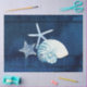 "Beach Ocean Sea Shells Seashells Navy Blue White Tissue Paper, heavy weight for decoupage or gift wrapping." A pair of lovely starfish and a Nautilus shell over a navy blue wooden background were elegantly hand painted in watercolors by internationally licensed artist and designer, Audrey Jeanne Roberts, copyright