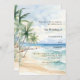 An elegant wedding invitation for a beach wedding, destination wedding. A watercolored sandy beach, ocean waves and palm trees as background.