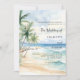 An elegant wedding invitation for a beach wedding, destination wedding. A watercolored sandy beach, ocean waves and palm trees as background.