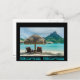 Postcard with a thatched parasol and two sunlounger chairs on a white sand beach in a luxury overwater bungalow resort in the clear blue lagoon of the pacific island of Bora Bora, near Tahiti in French Polynesia with a black border and the text: 'Bora Bora'.