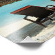 Photo print of a thatched parasol and two sunlounger chairs on a white sand beach in a luxury overwater bungalow resort in the clear blue lagoon of the pacific island of Bora Bora, near Tahiti in French Polynesia. Great decoration!
