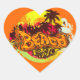 A fun illustration of a beach scene with dancing people, palm trees, the sun and a beach.