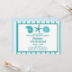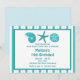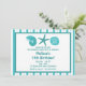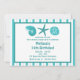 This fun beach party invitation features a sea shells and a starfish and customizable text on a teal and white striped background.