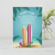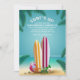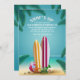 A great invitation choice to a surfing enthusiast's birthday celebration. Two upright surfboards are featured with a beach ball, starfish and tropical flowers all framed by palm fronds.