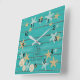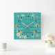 Personalize your coastal decor house or vacation cottage with this rustic beach themed wall clock. Your choice of round or square. Printed with a rustic wood plank pattern background in turquoise blue and starfish accents. Edit the text if desired. See many other coordinating items in this "Beach Stripes and Starfish" collection at Camp_and_Cottage on Zazzle.
