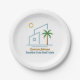 This cute tropical real estate company paper plate features a modern blue beach house with a cool palm tree and island sun. Customize this coastal home marketing item with your agent and realty business name for an open house.