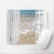 Open window with sheer curtains overlooking beach sand hearts with couple's names.