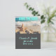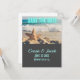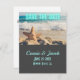 Modern, vertical non-traditional Save the Date announcement features beach scene (that includes waves and starfish in the sand) photography background with Save the Date in aqua blue neon. Personalize with wedding couple's details on dark grey background. Add additional info and a custom QR code on back.