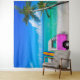 This tropical beach scene design features a bright fuchsia pink van and colourful surfboard near palm trees and on a white sand beach with turquoise sea blue water. This is the perfect design for a party photo booth backdrop, or for the surfer, for the college student's dorm room, for a bedroom, office, or any space where you want to bring in the tropics. Design and photographs of the beach and palm trees by T.K. Goforth and signed by the artist, all rights reserved.